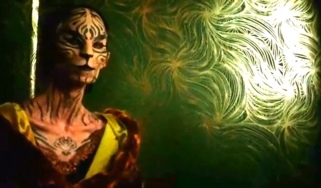 - « Es un ejemplo extremo de mejora quirúrgica fallida, porque seguro que ni siquiera en el Capitolio podrían encontrar atractiva esa cara. Le han estirado mucho la piel y tatuado con franjas negras y doradas; le han aplastado tanto la nariz que apenas existe […] El resultado es una grotesca máscara semifelina que nos observa con recelo »